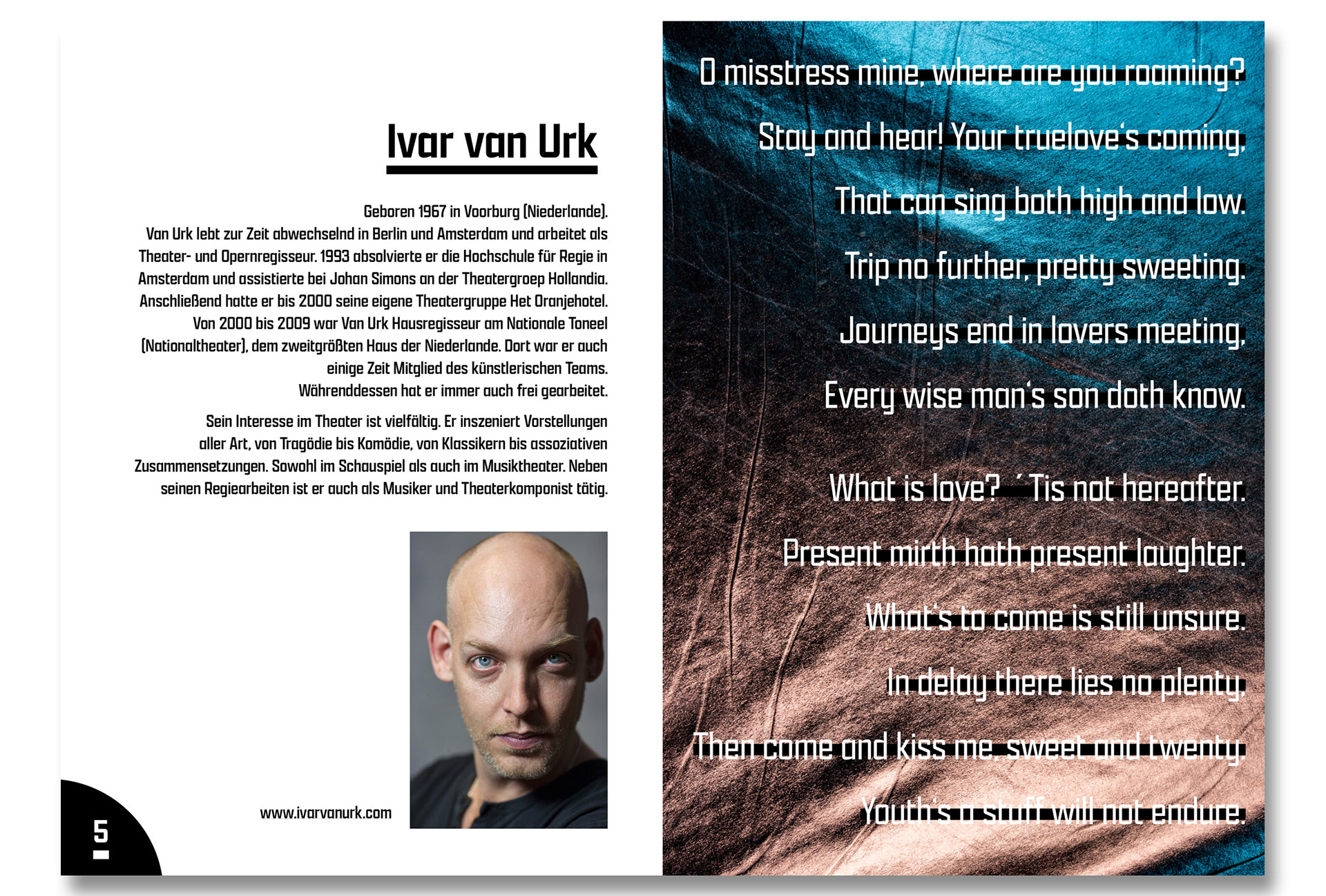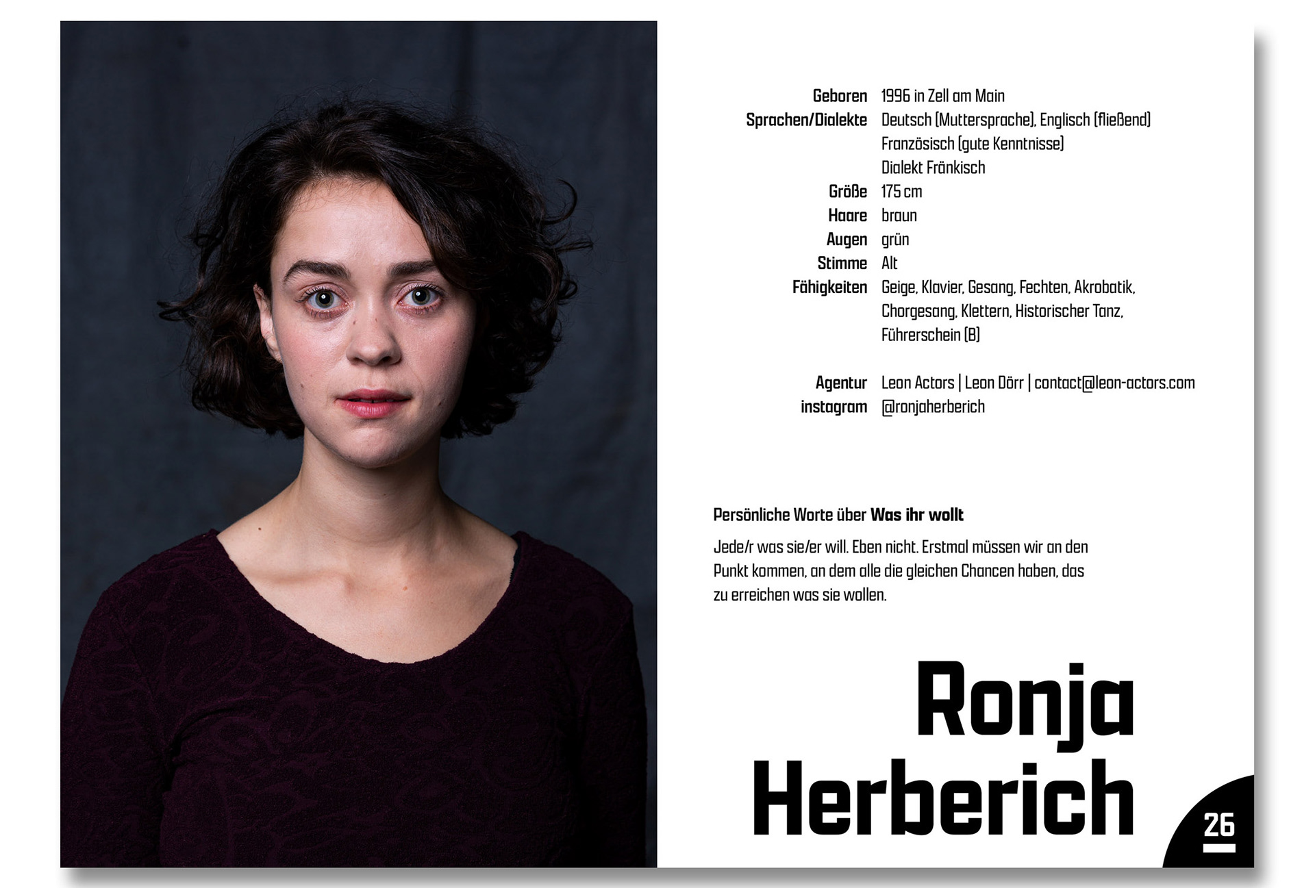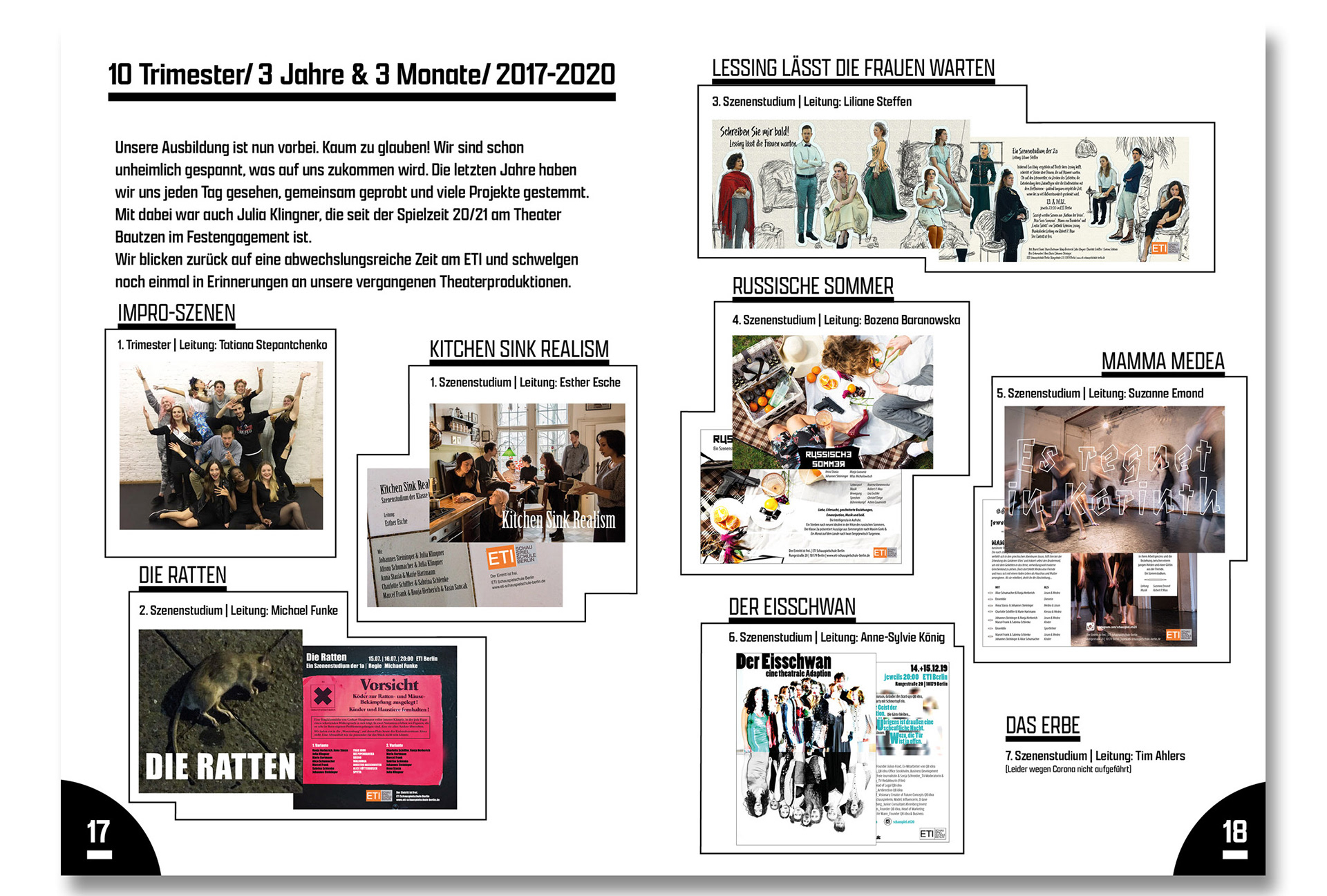 Die Abschlussklasse '20 des Europäischen Theaterinstituts Berlin spielt 2021 Das Theaterstück Was ihr wollt von William Shakespeare. Passend zum Thema Sehnsucht, Liebe und verschleierter Identitäten entstand ein Programmheft, das visuell ebenso laut schreien darf, wie die Figuren in dieser Inszenierung. Sie werden von 9 Schauspieler:innen ungeachtet der tatsächlichen Geschlechter gespielt. Es gibt keine festen Rollen. Wiedererkennbar werden die einzelnen Figuren durch einschlägige Perücken und Kostüme. Diese bilden einen Teil der fotografischen Highlights im Design. Das Herzstück des Hefts ist das Editorial der Darsteller:innen, ebenfalls fotografiert von Marcel Frank. Die eigens von Ivar van Urk (Regisseur) geschriebenen Songs sind als Texte im Programm prominent platziert. In der Mitte der Broschüre befindet sich ein Rückblick über 3 Jahre Schauspielausbildung der Schauspieler:innen. Schließlich bietet die letztes Sektion mit Steckbriefen einen Überblick über alle Absolvent:innen.